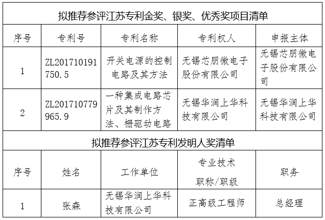 江蘇省半導(dǎo)體行業(yè)協(xié)會擬推薦申報第二屆江蘇專利獎、發(fā)明人獎情況的公示
