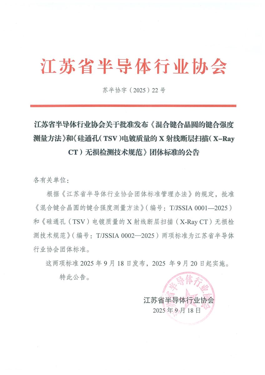 江蘇省半導(dǎo)體行業(yè)協(xié)會(huì)關(guān)于批準(zhǔn)發(fā)布《混合鍵合晶圓的鍵合強(qiáng)度測(cè)量方法》和《硅通孔(TSV)電鍍質(zhì)量的X射線斷層掃描(X-Ray CT)無(wú)損檢測(cè)技術(shù)規(guī)范》團(tuán)體標(biāo)準(zhǔn)的公告