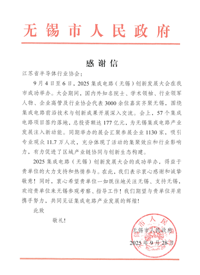 9月28日,無錫市人民政府發(fā)來感謝信,感謝江蘇省半導(dǎo)體行業(yè)協(xié)會對2025集成電路(無錫)創(chuàng)新發(fā)展大會的成功舉辦給予的大力支持和熱情參與,同時(shí)衷心希望江蘇協(xié)會一如既往地關(guān)注無錫、支持無錫,并肩攜手努力,共同見證集成電路產(chǎn)業(yè)發(fā)展的輝煌!